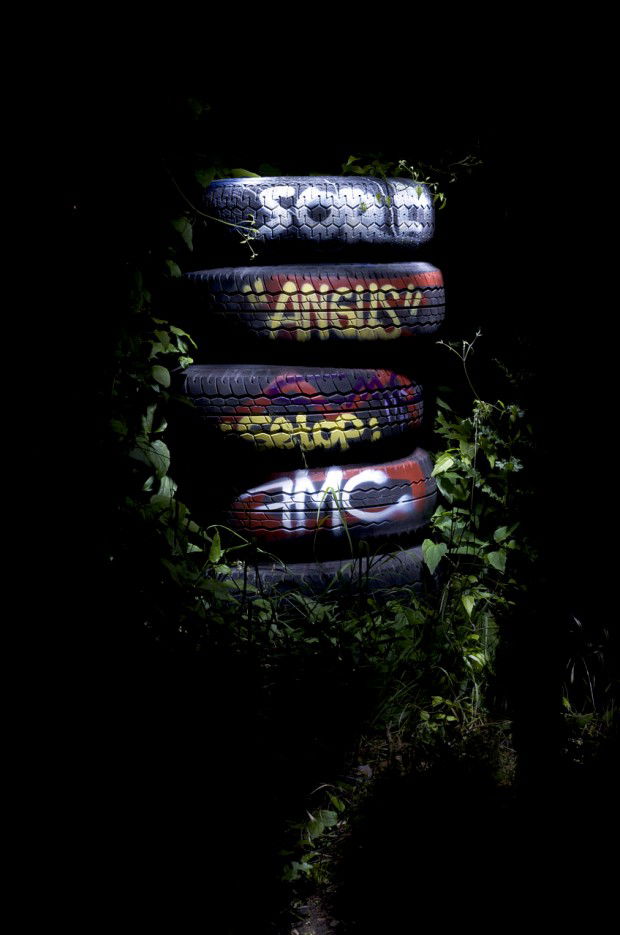 Night-Objects: Stapled Tyres, worked by »Angus«, »Setop«, »FMC« and others, spotted in the Hall of Fame at night. – Last of June 2013.