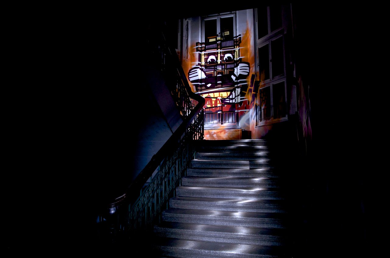 Back-to-School: Staircase-Work by »Ole von Oepen«, spotted in an abandoned School-Building at night. – 25. October 2013. Photos taken the night before Exhibition-Opening, late October 2013. The building of Paulus-Canisius School in Recklinghausen, Germany went out of service in summer 2012. It will be demolished in the forthcoming future. Back-to-School Exhibition of contemporary Graffiti-Art, was initiated by REspect4you in collaboration with Altstadtschmiede. Organized by Mr. Orm and supported by the City of Recklinghausen. – Special thanks to Mr. Orm for support, hospitality, beer and patience.